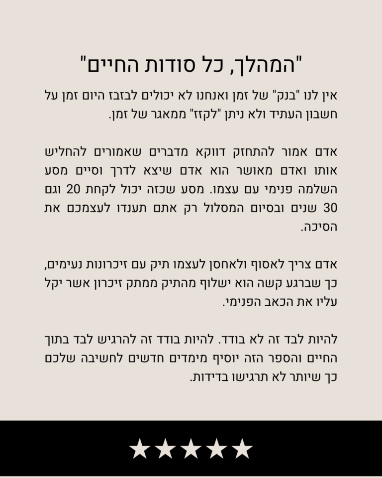 כשמסתכלים מהסוף להתחלה, רואים שכל רגש חזק נמרח על פני החיים, וכל דחייה של חלום נהפכת לצלקת קטנה על הלב. זה משאיר בך שאלה: האם כשאראה את הסרט שלי אחורה אני אתבייש או אחייך?